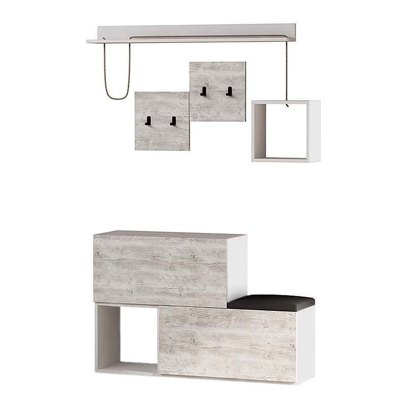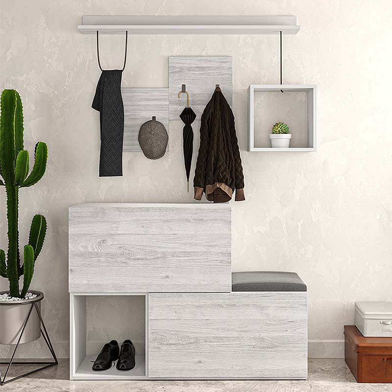 - Φέρει δύο κλειστά ντουλάπια για παπούτσια, ράφια – κουτιά για διακοσμητικά, κρεμάστρες και ένα αναπαυτικό μαξιλάρι καθίσματος σε χρώμα μαύρο.