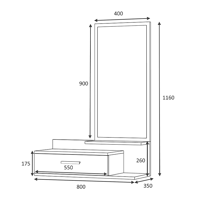 - Φέρει δύο ράφια, ένα συρτάρι και καθρέφτη.