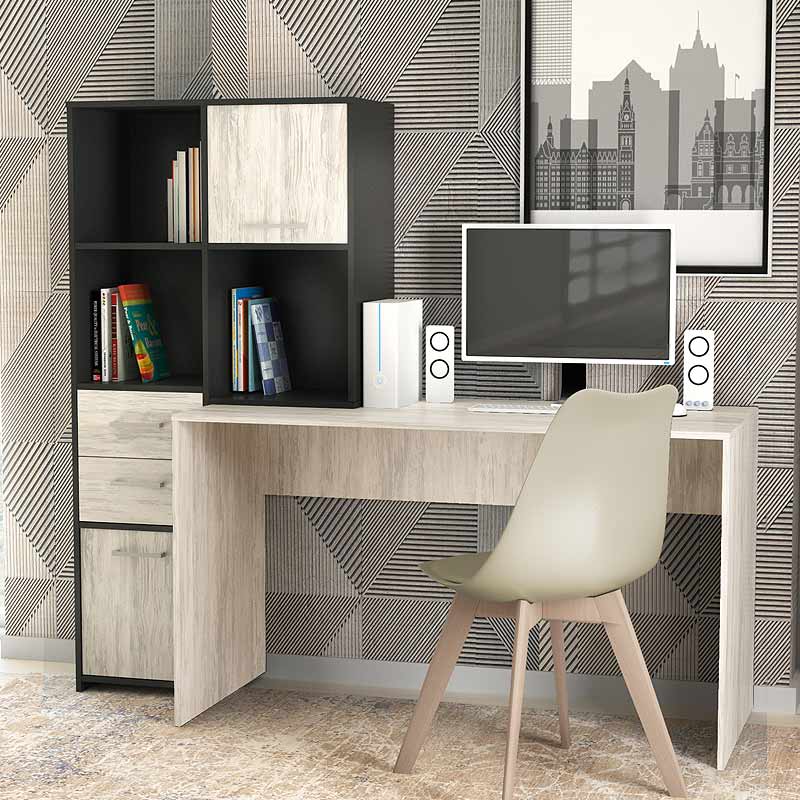 - Φέρει τρία ράφια βιβλιοθήκης, δυό ντουλάπια και δύο συρτάρια.