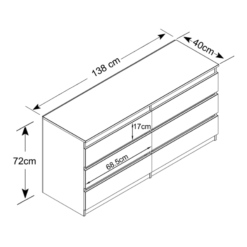 - Φέρει έξι συρτάρια, τρία στα δεξιά και τρία στ’ αριστερά.