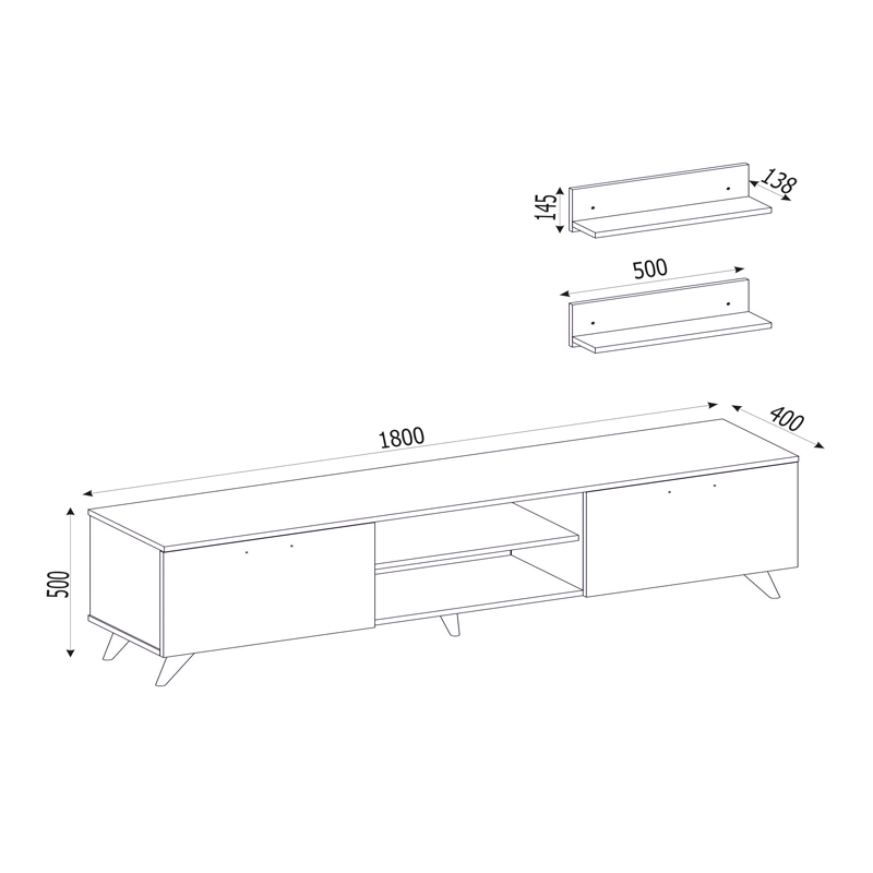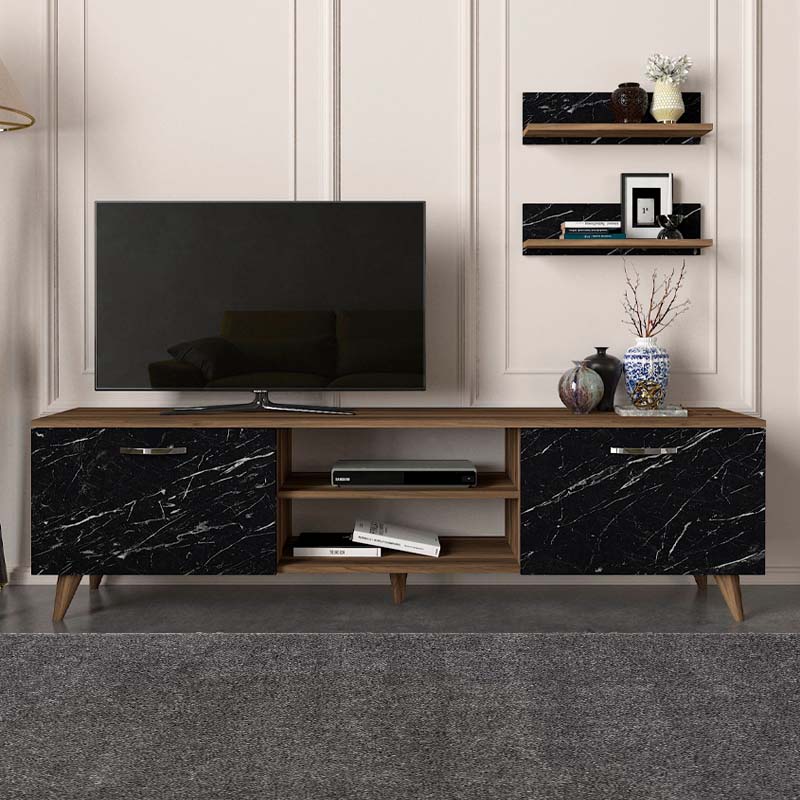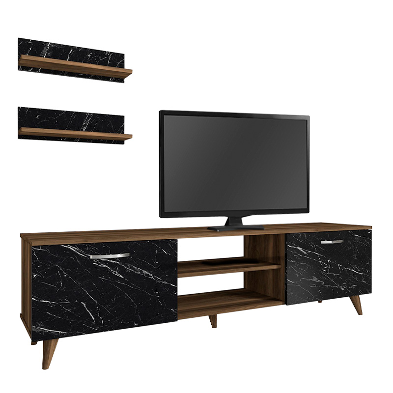 Έπιπλο τηλεόρασης Geacles Megapap από μελαμίνη χρώμα καρυδί – μαύρο εφέ μαρμάρου 180x40x50εκ.