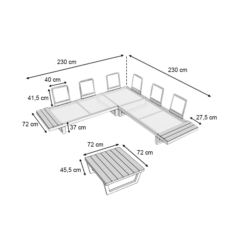- Γωνιακός καναπές: Μήκος 230 x Βάθος 230 x Ύψος 37 εκ.