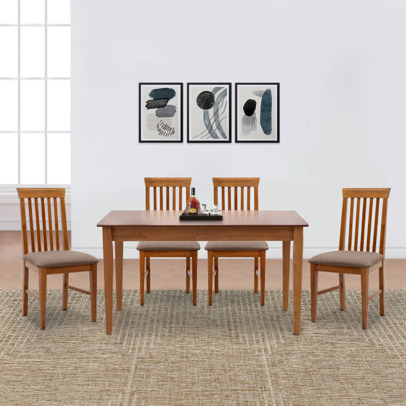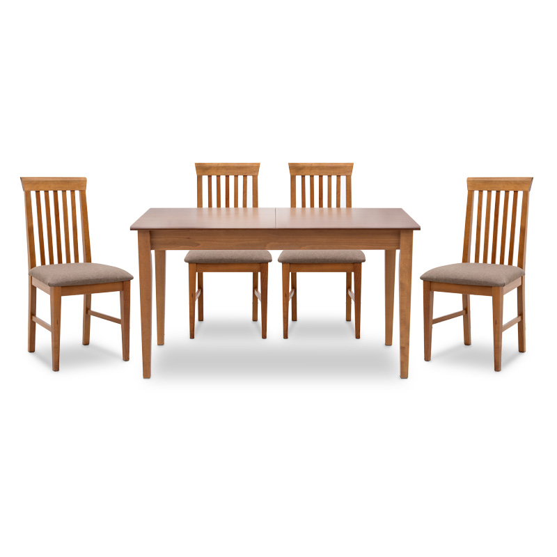 Για εσάς που ψάχνετε μια τραπεζαρία σε κλασσική γραμμή, η τραπεζαρία Adare σε χρώμα καρυδί είναι η ιδανική επιλογή και θα ταιριάξει σε κάθε σπίτι. Ο σκελετός του τραπεζιού και των καρεκλών είναι κατασκευασμένος από μασίφ ξύλο οξιάς που τον καθιστά στιβαρό και υψηλών αντοχών στο χρόνο. Η επιφάνεια του τραπεζιού είναι κατασκευασμένη από MDF εξαιρετικής ποιότητας. Η τραπεζαρία αποτελείται από ένα επεκτεινόμενο τραπέζι και τέσσερις καρέκλες.