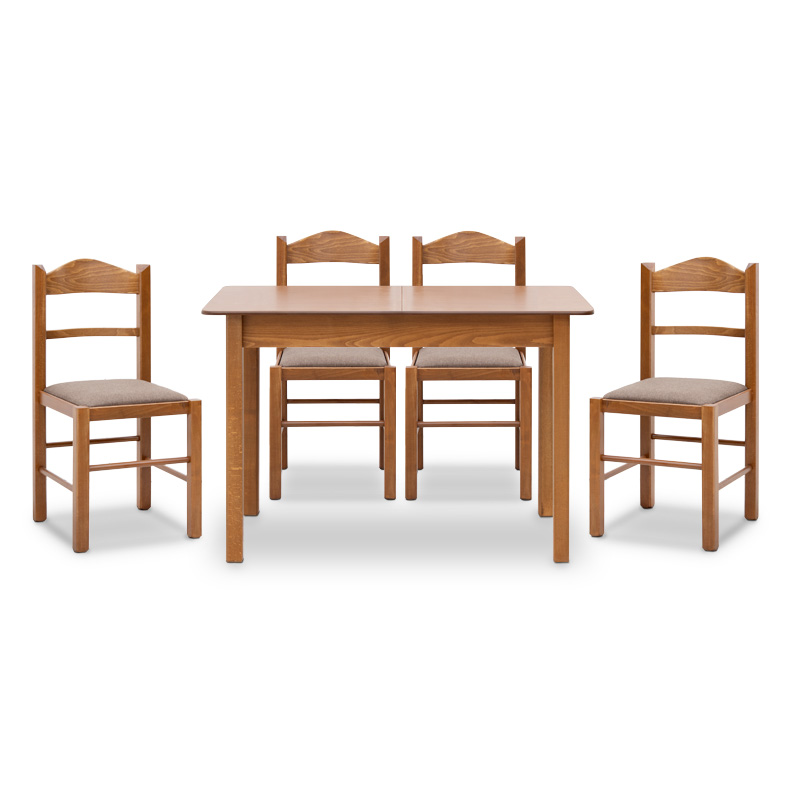 Για εσάς που ψάχνετε μια τραπεζαρία σε κλασσική γραμμή, η τραπεζαρία Bergen σε χρώμα καρυδί είναι η ιδανική επιλογή και θα ταιριάξει σε κάθε σπίτι. Ο σκελετός του τραπεζιού και των καρεκλών είναι κατασκευασμένος από μασίφ ξύλο οξιάς που τον καθιστά στιβαρό και υψηλών αντοχών στο χρόνο. Η επιφάνεια του τραπεζιού είναι κατασκευασμένη από MDF εξαιρετικής ποιότητας. Η τραπεζαρία αποτελείται από ένα επεκτεινόμενο τραπέζι και τέσσερις καρέκλες.